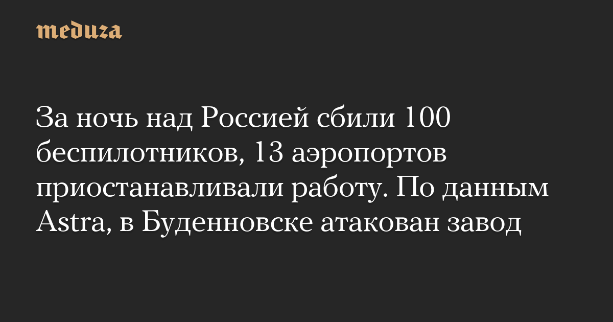 За ночь над Россией сбили 100 беспилотников, 13 аэропортов приостанавливали работу. По данным Astra, в Буденновске атакован завод