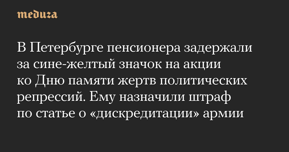 В Петербурге пенсионера задержали за сине-желтый значок на акции ко Дню памяти жертв политических репрессий. Ему назначили штраф по статье о «дискредитации» армии