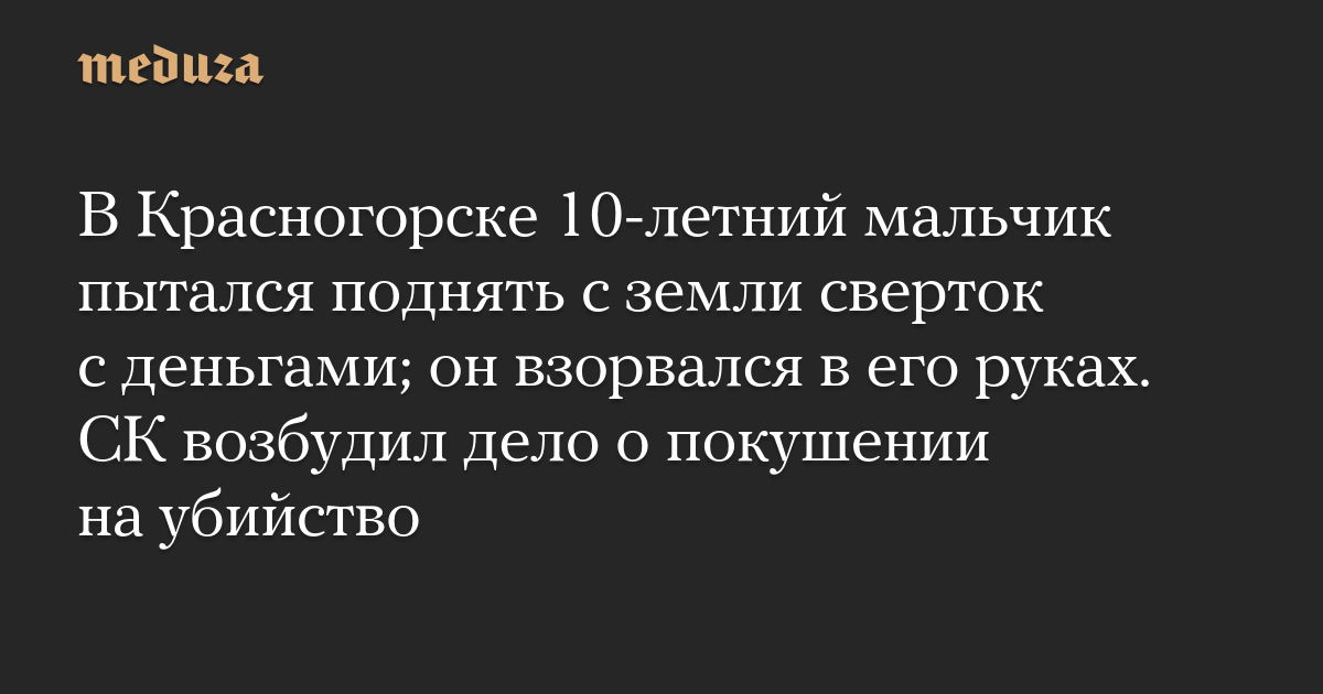В Красногорске 10-летний мальчик пытался поднять с земли сверток с деньгами; он взорвался в его руках. СК возбудил дело о покушении на убийство