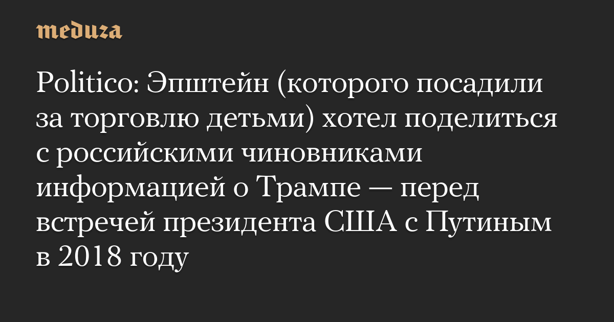 Politico: Эпштейн (которого посадили за торговлю детьми) хотел поделиться с российскими чиновниками информацией о Трампе — перед встречей президента США с Путиным в 2018 году