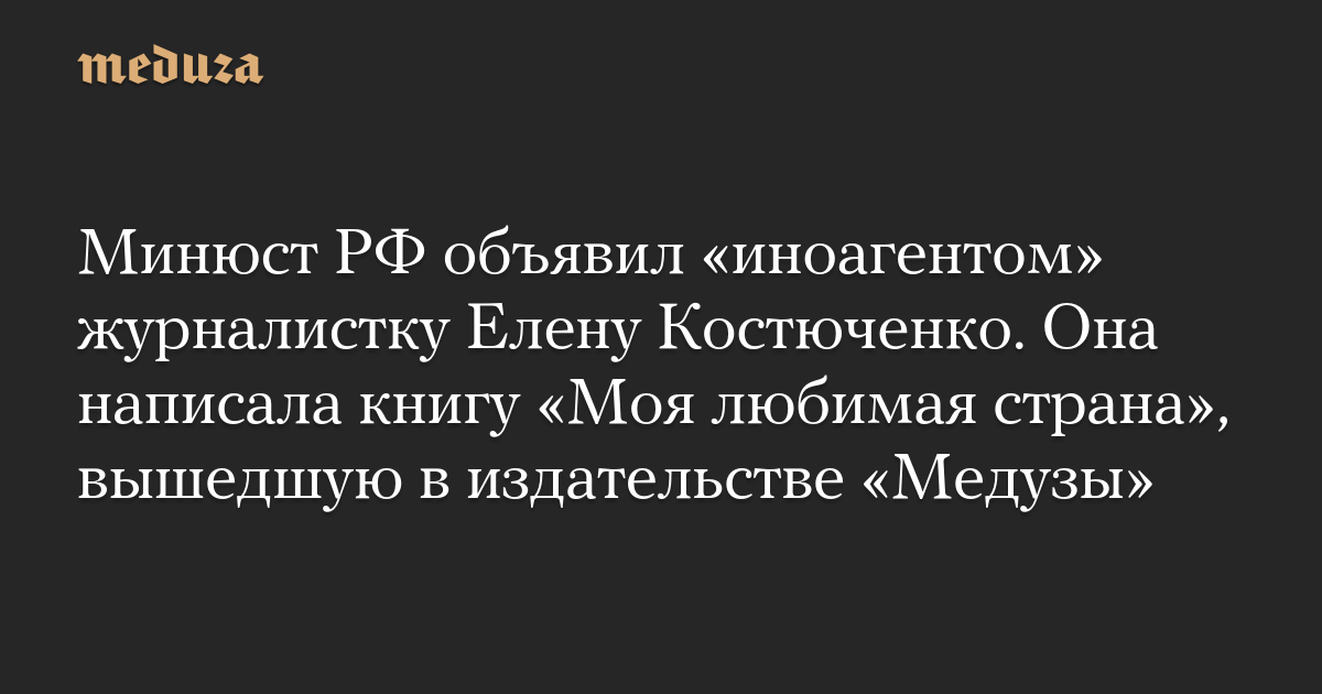 Минюст РФ объявил «иноагентом» журналистку Елену Костюченко. Она написала книгу «Моя любимая страна», вышедшую в издательстве «Медузы»