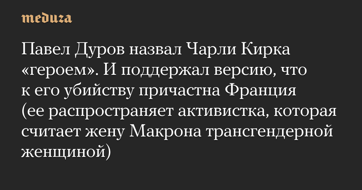 Павел Дуров назвал Чарли Кирка «героем». И поддержал версию, что к его убийству причастна Франция (ее распространяет активистка, которая считает жену Макрона трансгендерной женщиной)