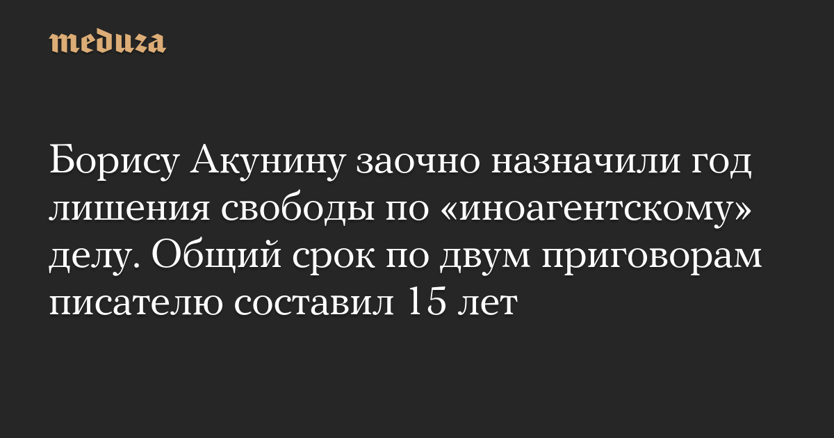 Обновлено. Суд заочно приговорил Бориса Акунина к одному году лишения свободы по обвинению в неисполнении обязанностей «иноагента», сообщает «Медиазона». По совокупности с предыдущим приговором писателю назначили 15 лет заключения. В случае исполнения приговора первые четыре года он должен провести в тюрьме, а остальное время — в колонии строгого режима.