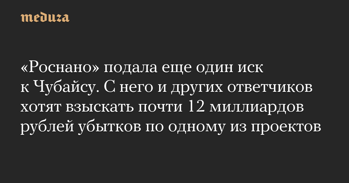 «Роснано» подала иск о взыскании 11,9 миллиарда рублей убытков по проекту Crocus к своим бывшим руководителям, в числе которых есть Анатолий Чубайс, пишут ТАСС и РБК со ссылкой на пресс-службу компании.