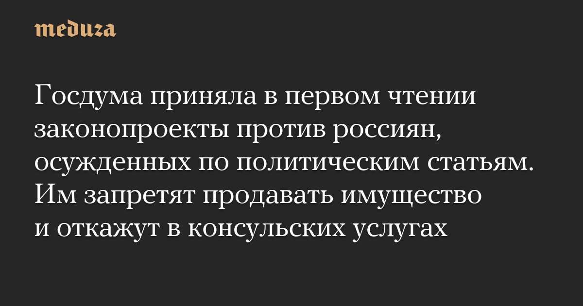 Госдума приняла в первом чтении законопроекты против россиян, осужденных по политическим статьям. Им запретят продавать имущество и откажут в консульских услугах