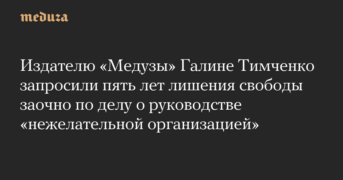 Прокуратура в ходе прений в Черемушкинском суде Москвы потребовала заочно приговорить издателя «Медузы» Галину Тимченко к пяти годам лишения свободы по делу о руководстве «нежелательной организацией», сообщает «Медиазона».