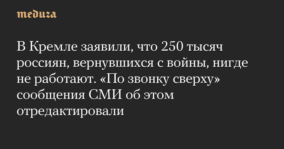 В Кремле заявили, что 250 тысяч россиян, вернувшихся с войны, нигде не работают. «По звонку сверху» сообщения СМИ об этом отредактировали
