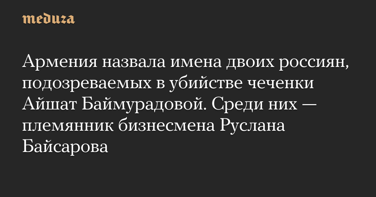 Армения назвала имена двоих россиян, подозреваемых в убийстве чеченки Айшат Баймурадовой. Среди них — племянник бизнесмена Руслана Байсарова
