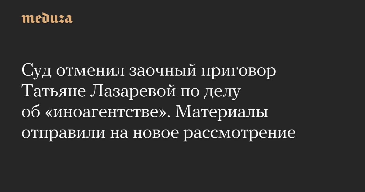 Мосгорсуд отменил заочный приговор телеведущей Татьяне Лазаревой, вынесенный по делу об уклонении от обязанностей «иноагента» (часть 2 статьи 330.1 УК), сообщил ее адвокат Леонид Соловьев.