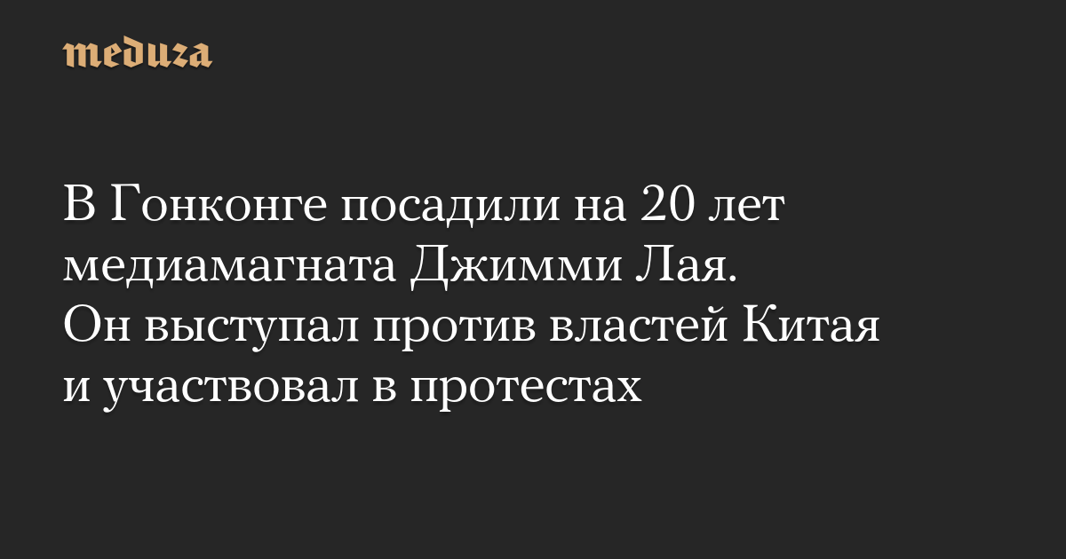 Суд в Гонконге приговорил к 20 годам лишения свободы 78-летнего медиамагната и оппозиционера Джимми Лая по обвинениям в преступлениях против национальной безопасности.