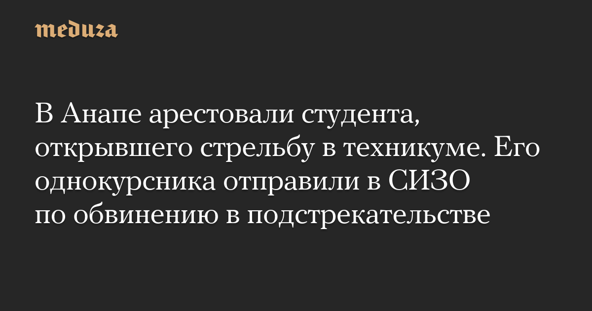 Обновление. Суд арестовал студента, который 11 февраля открыл стрельбу в техникуме Анапы, по обвинению в убийстве, покушении на убийство двух и более лиц и хищении оружия. Его однокурсник арестован по обвинению в подстрекательстве.