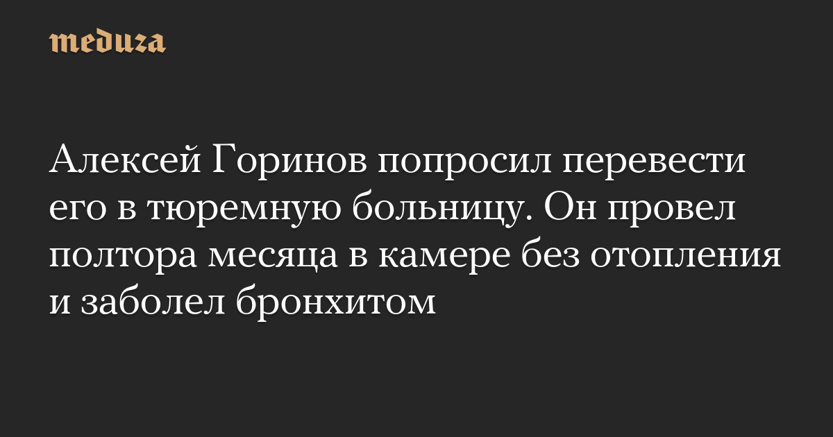 Бывший московский муниципальный депутат Алексей Горинов, который отбывает срок в алтайской ИК-10 и полтора месяца сидит в камере без отопления, написал заявление о переводе в лечебно-исправительное учреждение из-за бронхита. Об этом стало известно «Медиазоне» в ходе заседания, где рассматривалась жалоба защиты Горинова.