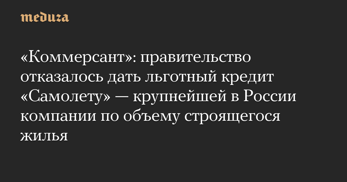 Правительство России отказалось предоставлять строительной компании «Самолет» льготный кредит на 50 миллиардов рублей, о которой ранее попросил застройщик, сообщила 18 февраля газета «Коммерсант», ссылаясь на источники.