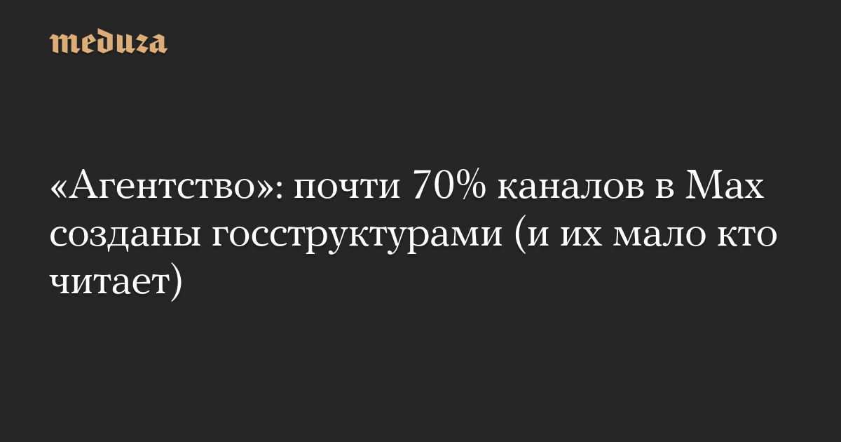 По данным «Агентства», общая аудитория 169 тысяч каналов в Max составляет 88,3 миллиона подписчиков (но не пользователей вообще). На каналы госструктур подписаны только 26,3 миллиона подписчиков (около 30%). Таким образом, в среднем один госканал читают 220 подписчиков.