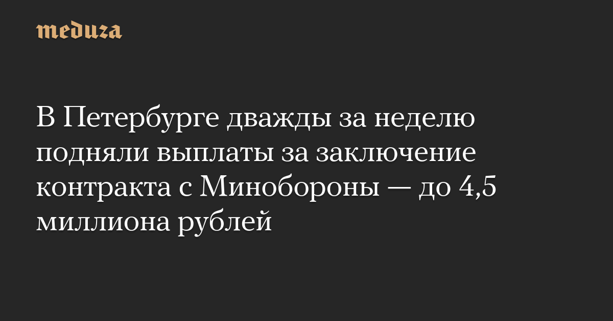 Власти Петербурга на 500 тысяч повысили единовременную выплату при заключении контракта с Минобороны РФ — теперь она составляет 4,1 миллиона рублей. Это второе повышение за неделю, отмечают «Фонтанка» и «Ротонда».