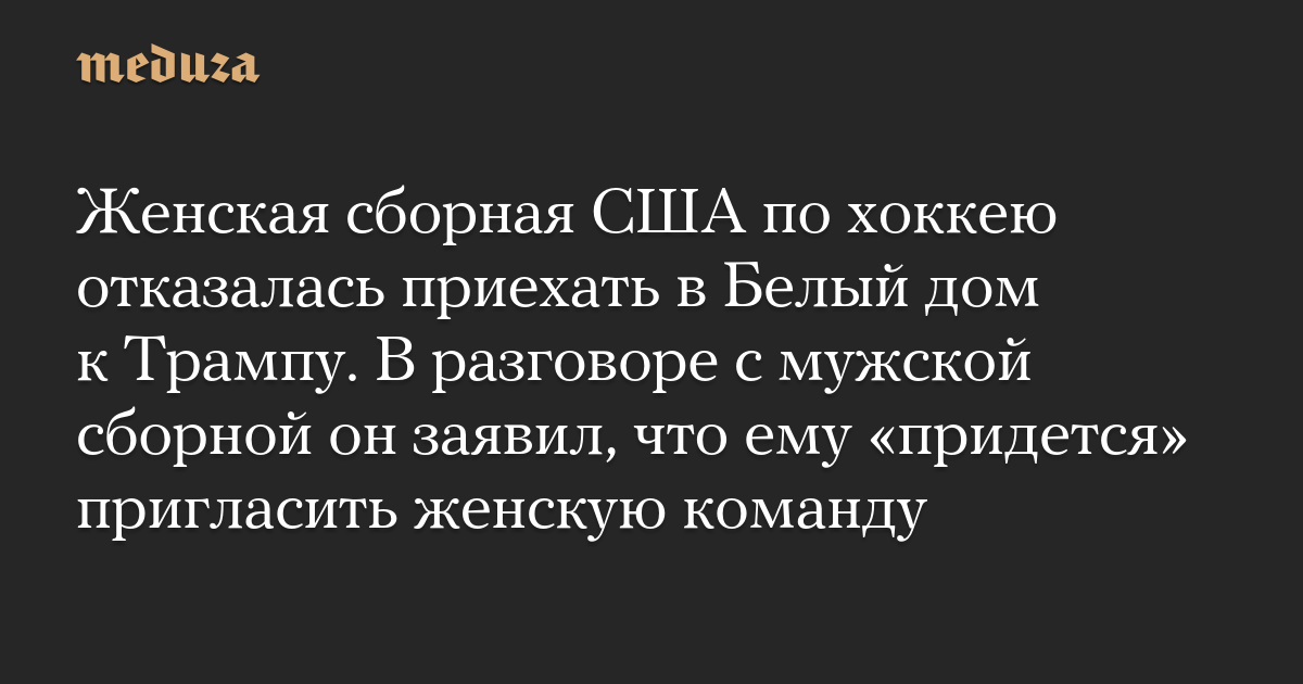 Женская сборная США по хоккею отказалась приехать в Белый дом к Трампу. В разговоре с мужской сборной он заявил, что ему «придется» пригласить женскую команду