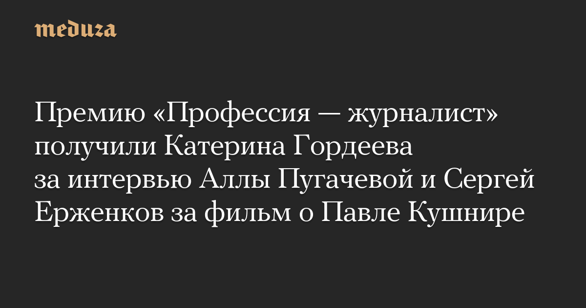 Премию «Профессия — журналист» получили Катерина Гордеева за интервью Аллы Пугачевой и Сергей Ерженков за фильм о Павле Кушнире
