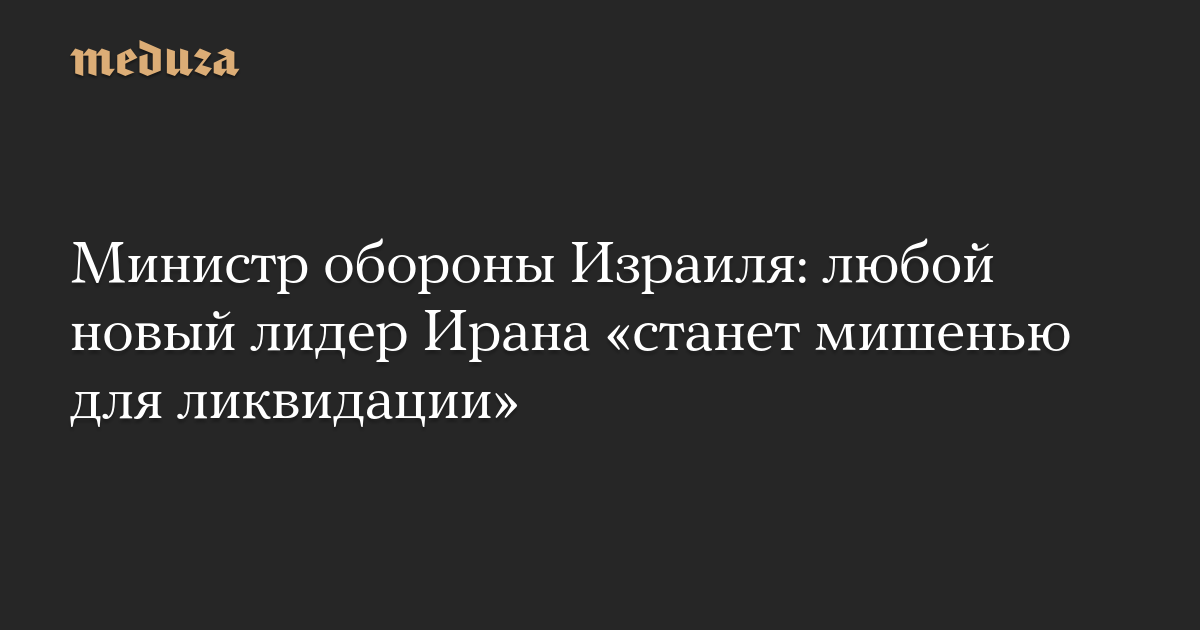 Израиль будет считать любого нового лидера Ирана «безоговорочной мишенью для ликвидации». Об этом написал в соцсети X министр обороны Израиля Исраэль Кац.