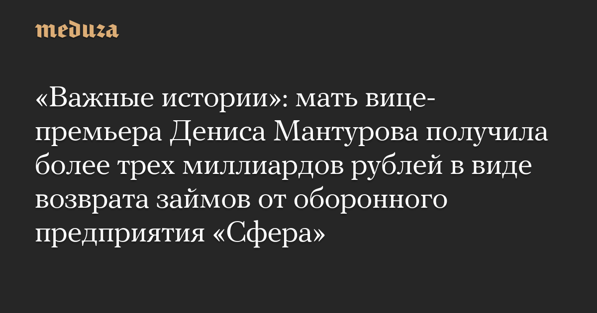 «Важные истории»: мать вице-премьера Дениса Мантурова получила более трех миллиардов рублей в виде возврата займов от оборонного предприятия «Сфера»