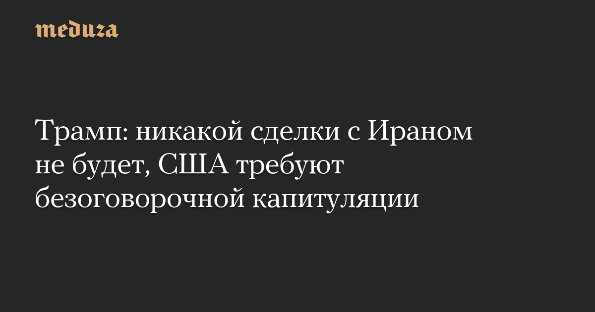 Дональд Трамп потребовал от Ирана безоговорочной капитуляции. «Никакой сделки с Ираном не будет — только безоговорочная капитуляция!» — написал президент США в соцсети Truth Social.
