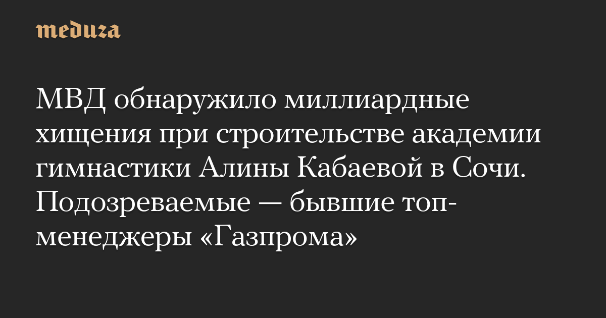 МВД обнаружило миллиардные хищения при строительстве академии гимнастики Алины Кабаевой в Сочи. Подозреваемые — бывшие топ-менеджеры «Газпрома»