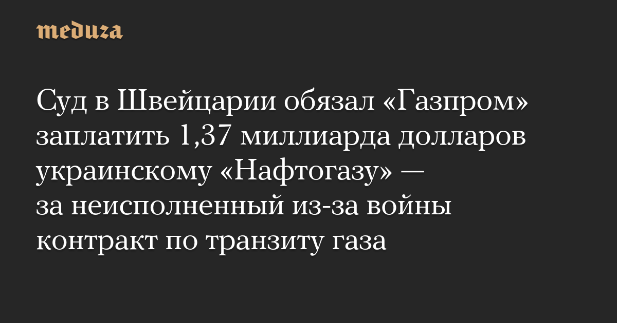 Суд в Швейцарии обязал «Газпром» заплатить 1,37 миллиарда долларов украинскому «Нафтогазу» — за неисполненный из-за войны контракт по транзиту газа