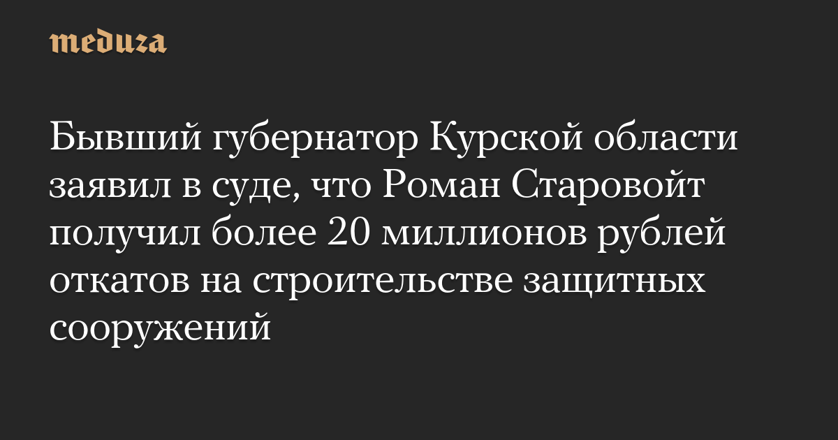 Бывший губернатор Курской области заявил в суде, что Роман Старовойт получил более 20 миллионов рублей откатов на строительстве защитных сооружений