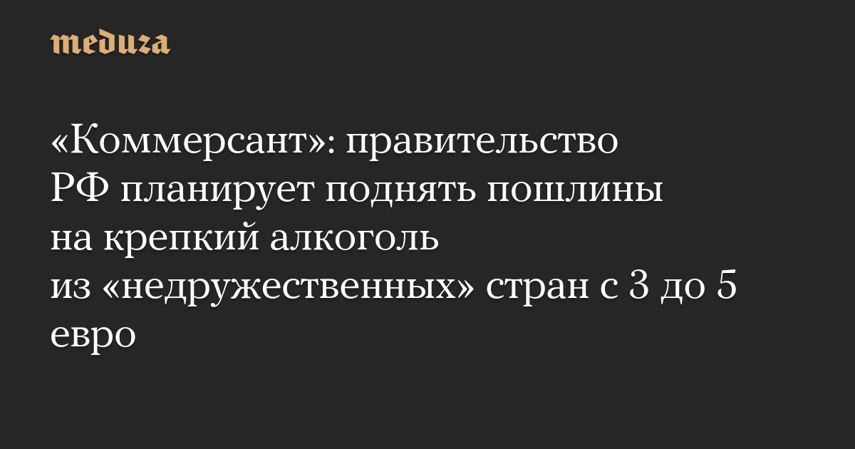 Пошлины на крепкий алкоголь из «недружественных стран» с 1 мая 2026 года планируется повысить с 3 до 5 евро за 1 литр спирта, пишет «Коммерсант» со ссылкой на три источника на алкогольном рынке.