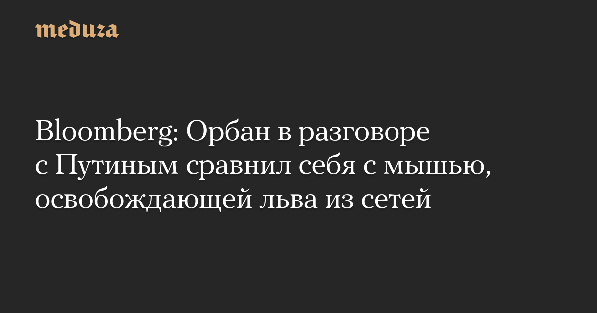 Премьер-министр Венгрии Виктор Орбан в телефонном разговоре с российским президентом Владимиром Путиным в октябре 2025 года сравнил себя с «мышью», помогающей «льву», пишет Bloomberg со ссылкой на стенограмму беседы, оказавшейся в распоряжении журналистов.