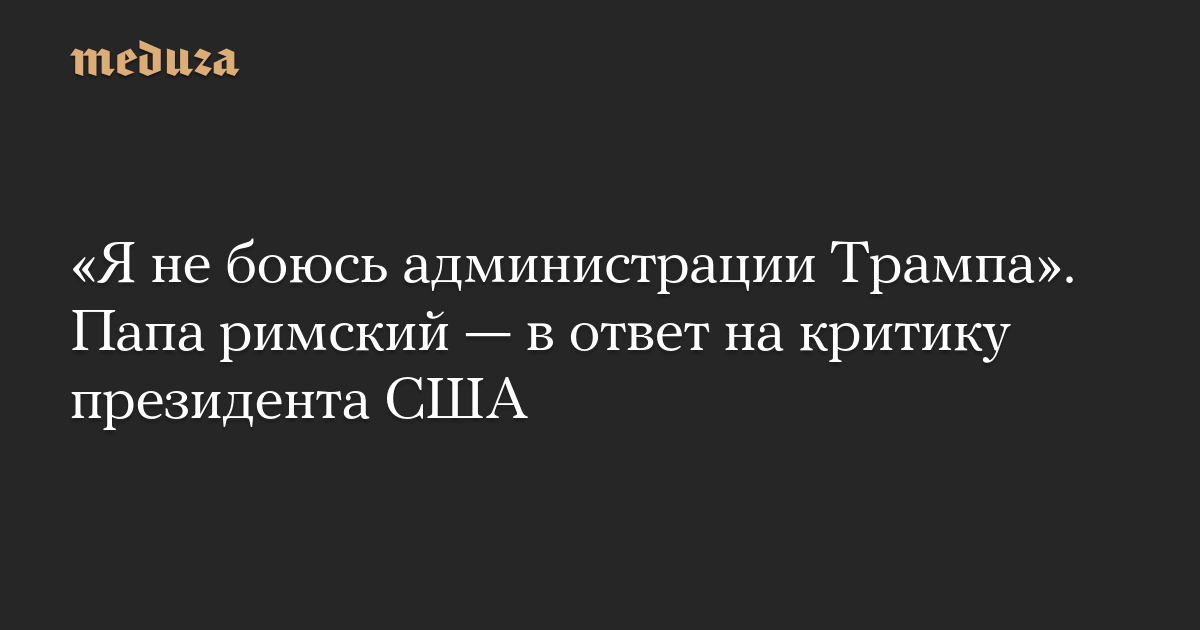 «Я не боюсь администрации Трампа и не боюсь громко заявлять о послании Евангелия, ведь именно для этого я здесь, именно для этого и существует церковь. Мы не политики, мы не подходим к внешней политике с той же точки зрения, с какой, возможно, понимает ее он [Дональд Трамп]», — сказал папа римский журналистам на борту самолета, направляясь в Алжир.