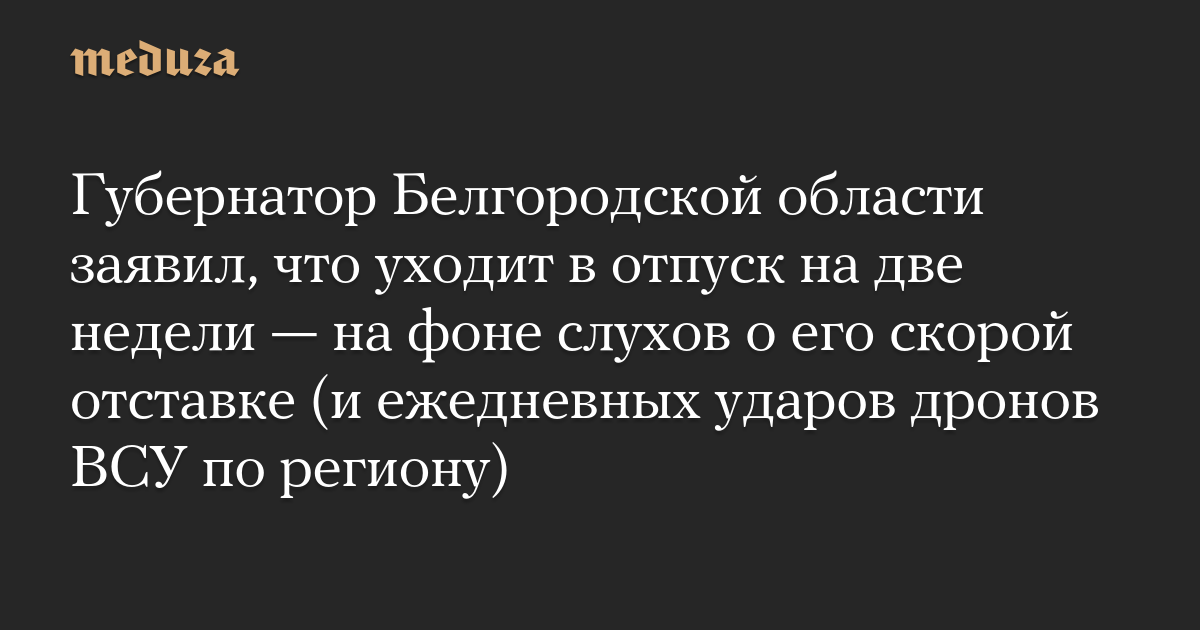 Губернатор Белгородской области заявил, что уходит в отпуск на две недели — на фоне слухов о его скорой отставке (и ежедневных ударов дронов ВСУ по региону)
