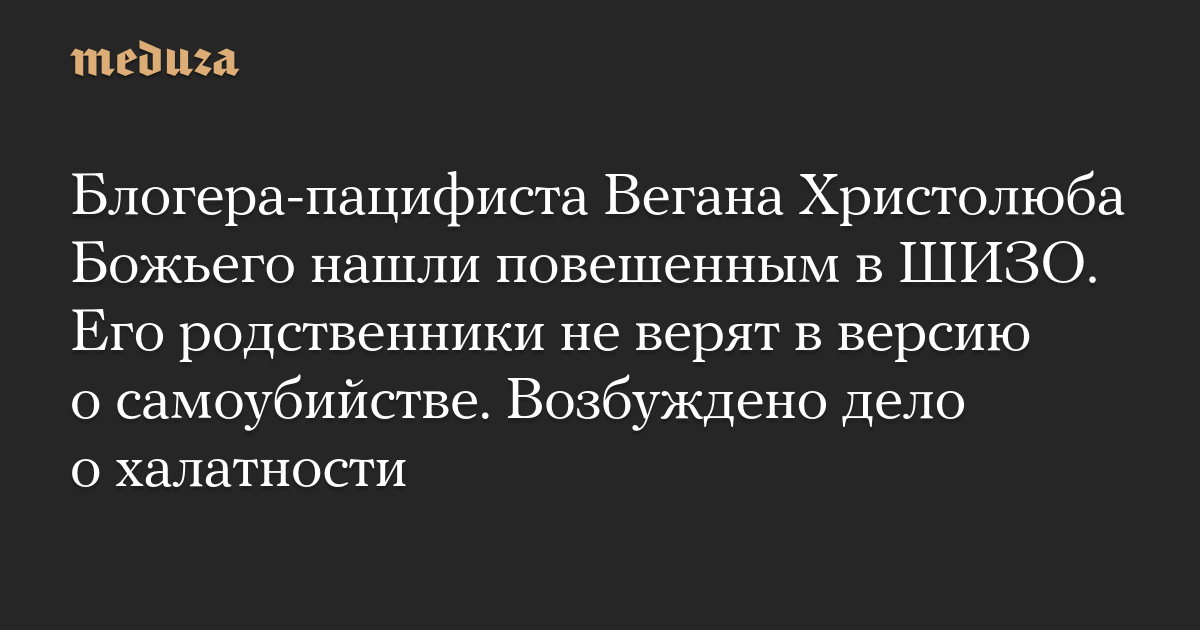 Из-за гибели в воронежской колонии блогера-пацифиста Вегана Христолюба Божьего возбуждено уголовное дело о халатности (статья 293 УК). Заключенного нашли повешенным в камере штрафного изолятора (ШИЗО), рассказал знакомый блогера Sotavision и «Осторожно, новости».