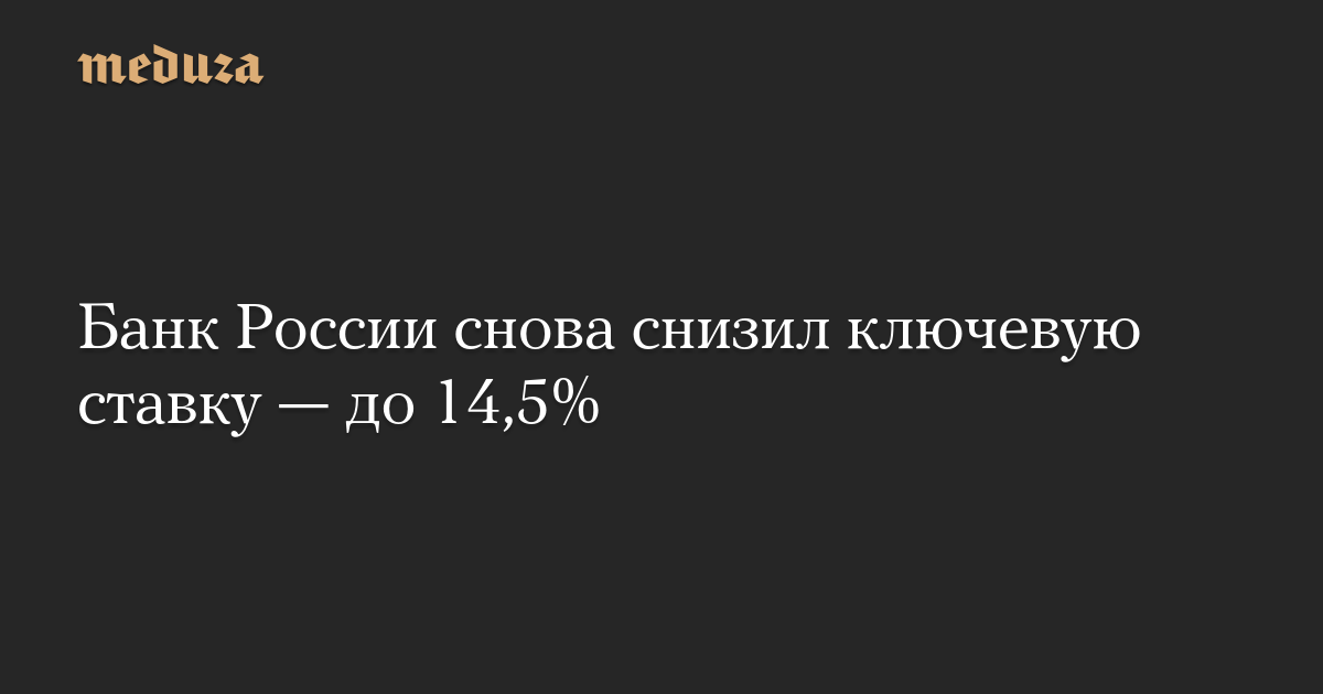 Совет директоров Банка России принял решение снизить ключевую ставку на 50 базисных пунктов — до 14,5%. Об этом сообщается на сайте регулятора.