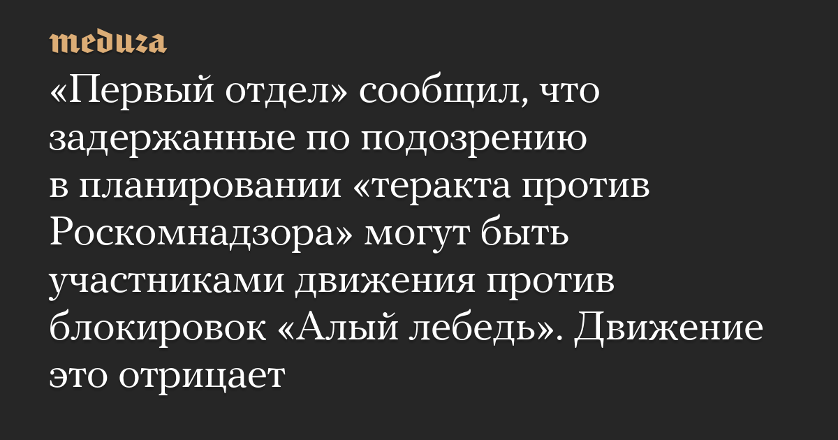 «Первый отдел» сообщил, что задержанные по подозрению в планировании «теракта против Роскомнадзора» могут быть участниками движения против блокировок «Алый лебедь». Движение это отрицает