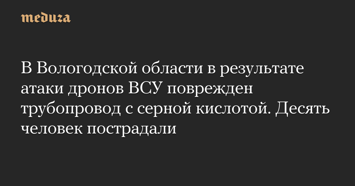 В Вологодской области в результате атаки дронов ВСУ поврежден трубопровод с серной кислотой. Пять человек пострадали