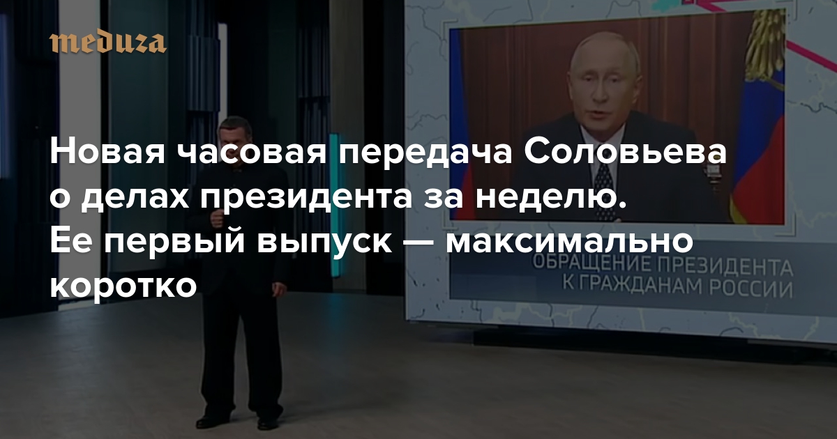 «Путин не только любит детей — он вообще любит людей» Новая часовая передача Соловьева о делах президента за неделю. Ее первый выпуск — максимально коротко