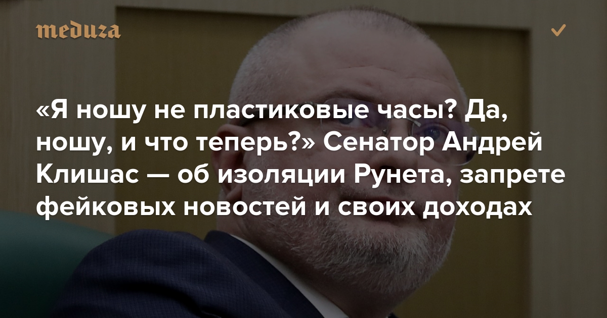 «Я ношу не пластиковые часы? Да, ношу, и что теперь?» Сенатор Андрей Клишас — об изоляции Рунета, запрете фейковых новостей и своих доходах