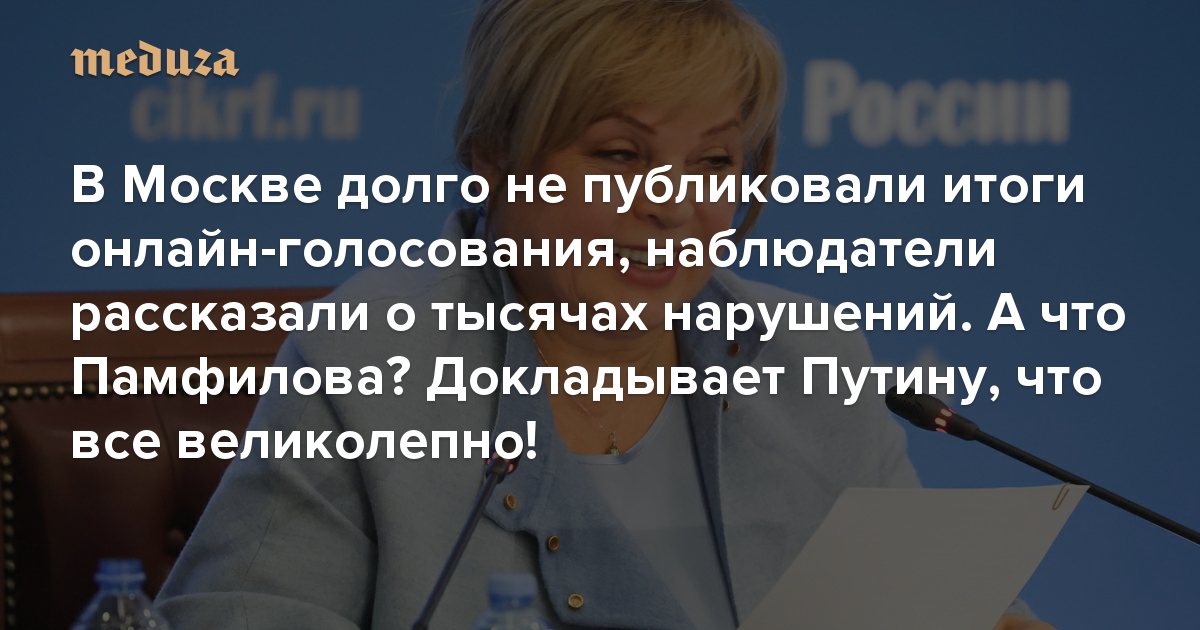 В Москве долго не публиковали итоги онлайн-голосования, наблюдатели рассказали о тысячах нарушений. А что Памфилова? Докладывает Путину, что все великолепно!