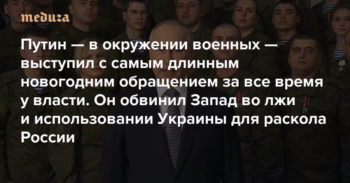 Путин — в окружении военных — выступил с самым длинным новогодним обращением за все время у власти. Он обвинил Запад во лжи и использовании Украины для раскола России Вот его краткий пересказ