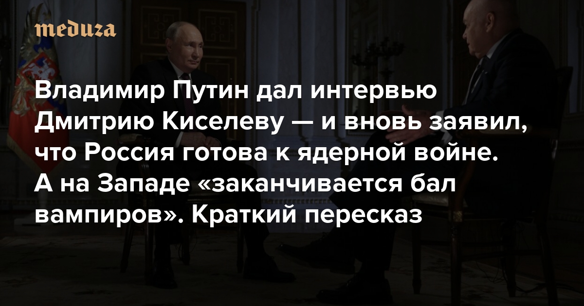 Путин дал интервью Дмитрию Киселеву — и вновь заявил, что Россия готова к ядерной войне. А на Западе «заканчивается бал вампиров» Краткий пересказ