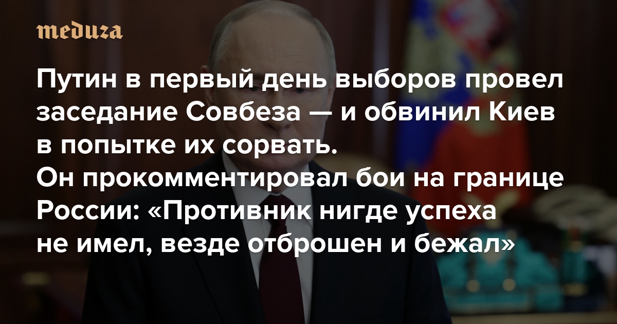 Путин в первый день выборов провел заседание Совбеза — и обвинил Киев в попытке их сорвать Он прокомментировал бои на границе России: «Противник нигде успеха не имел, везде отброшен и бежал»