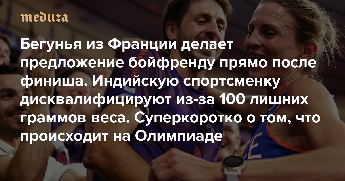 Бегунья из Франции делает предложение бойфренду прямо после финиша. Индийскую спортсменку дисквалифицируют из-за 100 лишних граммов веса Париж-2024. Суперкоротко о том, что происходит на Олимпиаде