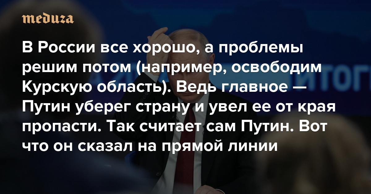 В России все хорошо, а проблемы решим потом (например, освободим Курскую область). Ведь главное — Путин уберег страну и увел ее от края пропасти Так считает сам Путин. Вот что он сказал на прямой линии — максимально коротко