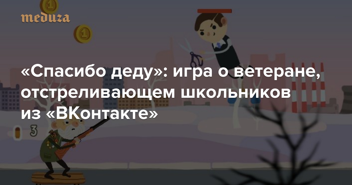 В середине апреля во «ВКонтакте» появилась игра «Спасибо деду», в которой пользователям предлагают устроить отстрел школьников. Главный герой игры — пожилой мужчина с медалями и георгиевской ленточкой, который видит в социальной сети проявление неуважения к ветеранам Великой Отечественной войны и начинает мстить.