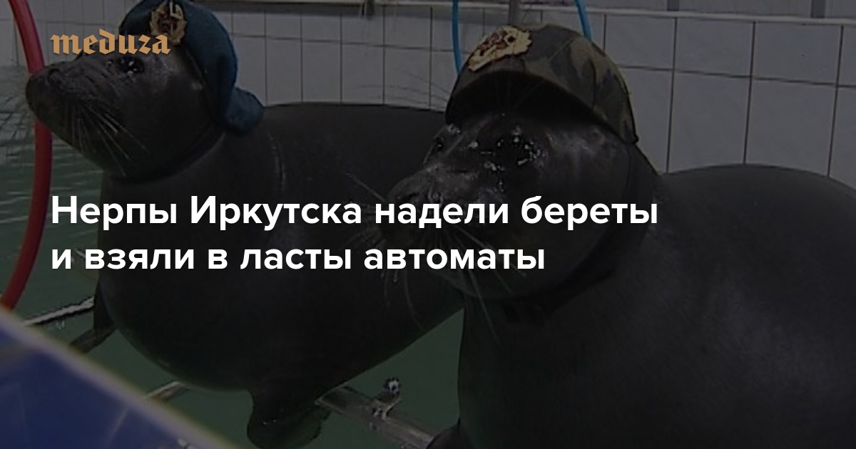 В иркутском нерпинарии подготовили «военно-патриотическую программу»: нерп Ласку и Винни-Пуха научили носить береты на головах и держать автоматы и флаги в ластах. Кроме того, животные открывают пасти, симулируя воинское приветствие, и машут ластами, словно генсеки, принимающие парад Победы.
