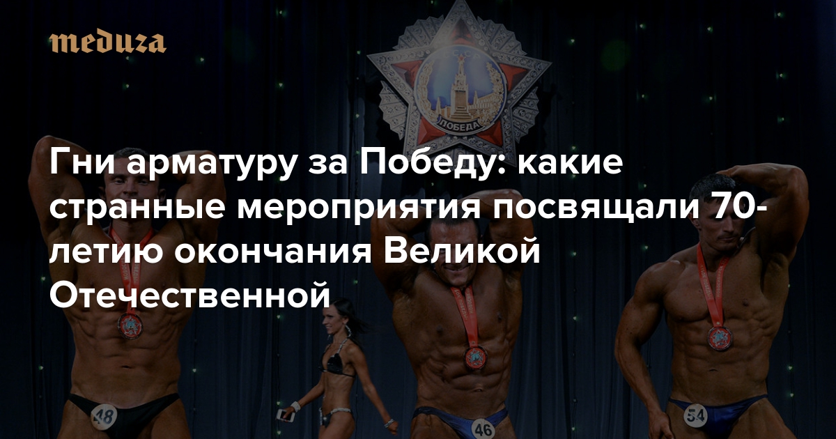 Например, в Новосибирске состоялся чемпионат по бодибилдингу «Кубок Победы». Накачанные мужчины и женщины в белье демонстрировали возможности своих тел на фоне гигантского ордена «Победа» — как будто так и должно быть (похожее мероприятие, тоже посвященное Дню Победы, прошло и в Киргизии; но там, кажется, обошлось без гигантского ордена и георгиевской ленты). Выступление бодибилдеров, к счастью, никого не оскорбило — в отличие от девичьих танцев рядом с мемориалом «Малая земля» в Новороссийске.