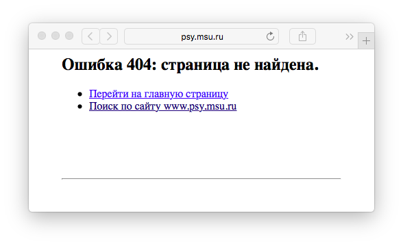 Интернет-пользователи обнаружили на сайте факультета психологии МГУ необычную 404-ю страницу, которая появляется, когда пользователь пытается открыть несуществующую страницу. Изначально сообщение об ошибке выглядит стандартно.
