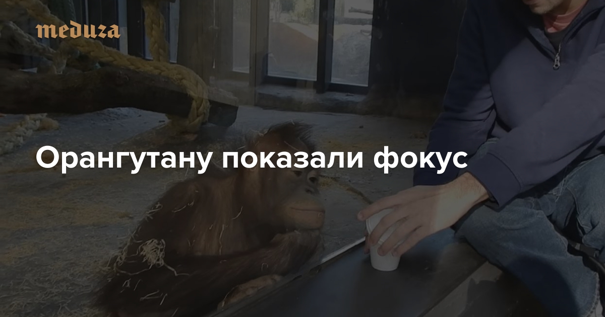 Посетитель зоопарка (какого именно, неизвестно) подсел к вольере с орангутаном и показал ему фокус. Он положил предмет в стаканчик, закрыл крышку, потряс, а затем вновь открыл крышку. Стаканчик оказался пустым.