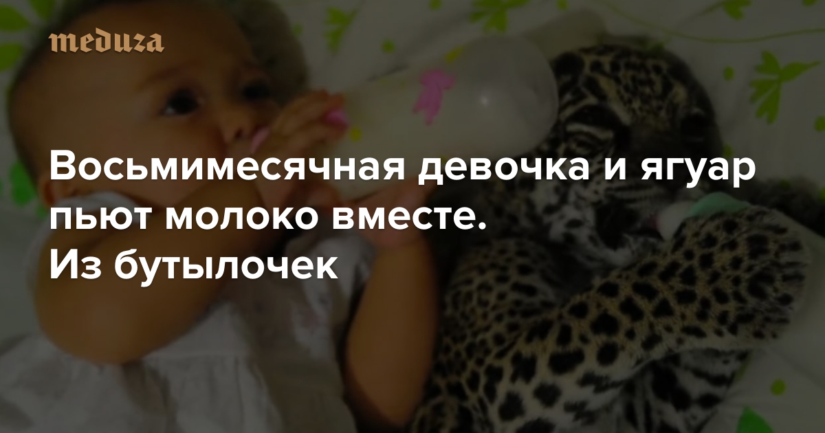 Восьмимесячная девочка и ягуар пьют молоко вместе. Из бутылочек