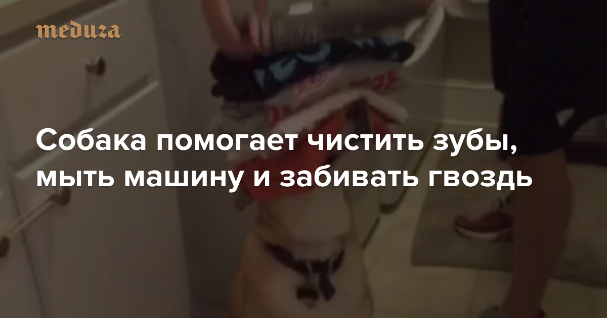 Собака помогает чистить зубы, мыть машину и забивать гвоздь